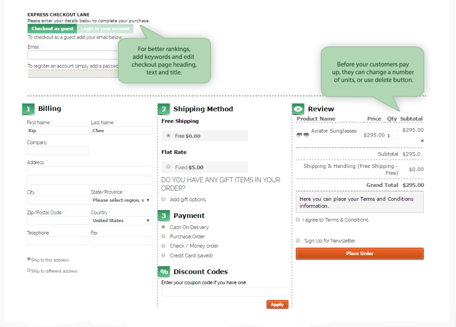 - Option to combine Cart and Checkout into one page
